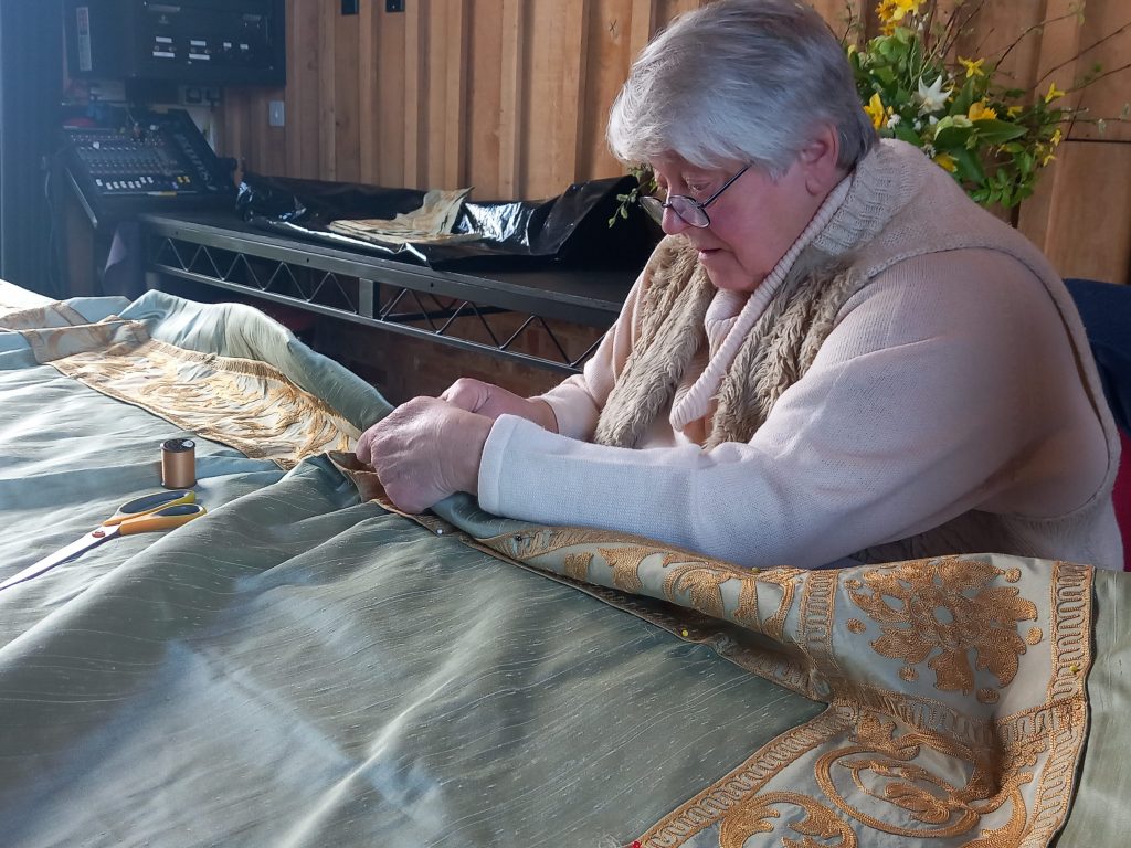 Since 1999, the Arts Society (formerly NADFAS) Heritage Volunteer Conservation group has been dedicated to caring for and conserving the textiles at Hellens. Their meticulous work, involving thousands of tiny couching stitches, is evident throughout the manor house.