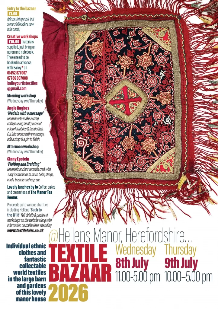 Individual ethnic clothes and fantastic, collectable world textiles on sale. Morning and afternoon workshops.